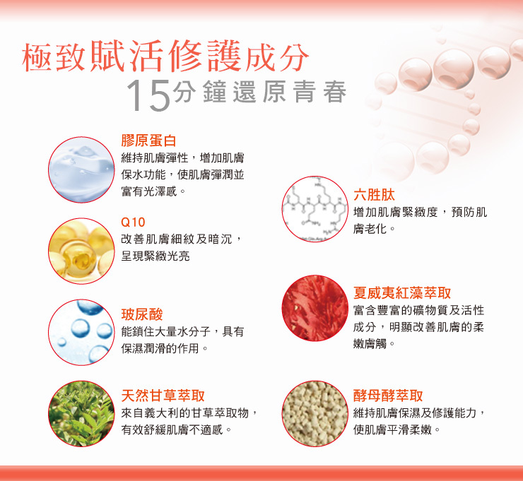 ◆ 特別添加膠原蛋白、六胜肽、輔酶Q10及酵母萃取等多重抗皺成分