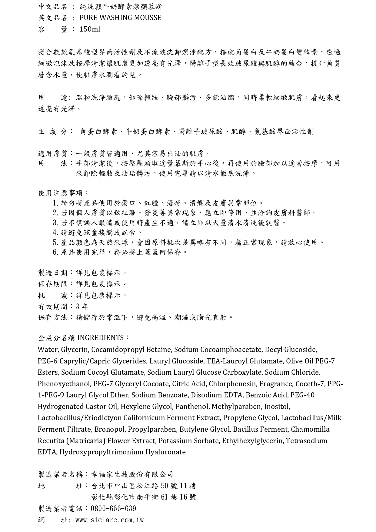 純洗顏牛奶酵素潔顏慕斯150ml